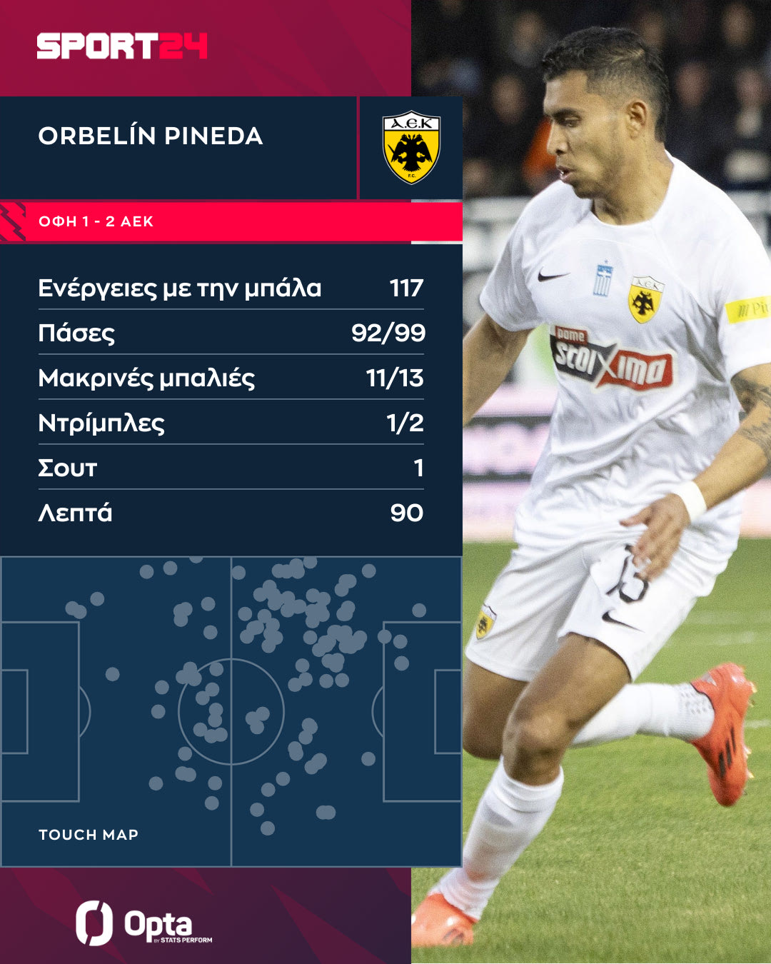 Ο Πινέδα έκανε το πιο γεμάτο παιχνίδι φέτος με την ΑΕΚ και το πιο πληθωρικό μεταξύ των συμπαικτών του στη φετινή Stoiximan Super League. Ο Μεξικανός ολοκλήρωσε το παιχνίδι με 117 ενέργειες με την μπάλα. Βέβαια το γεγονός ότι η ΑΕΚ ολοκλήρωσε το ματς με 80% κατοχή και ο ΟΦΗ έπαιξε με παίκτη λιγότερο από το 21′, το έκανε πιο “εύκολο” στον Πινέδα να φτάσει αυτό τον αριθμό ενεργειών.