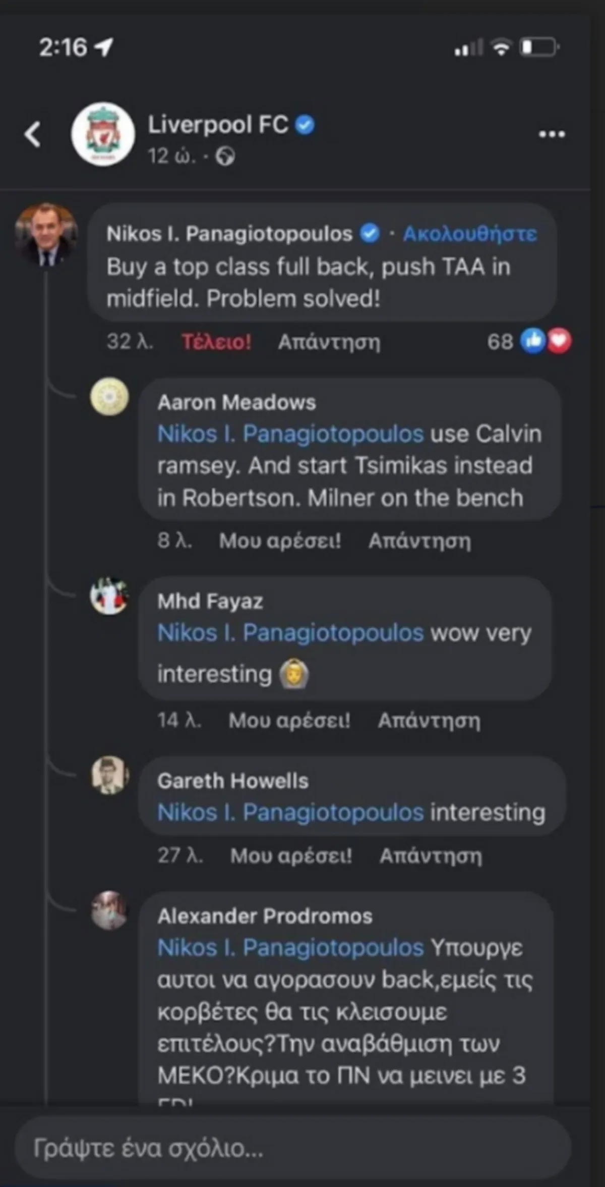Βλέποντας την κατάσταση σύγχυσης και πανικού της αγγλικής άμυνας, ο Υπουργός Άμυνας, Νίκος Παναγιωτόπουλος, αποφάσισε να επέμβει μέσω τοποθέτησής του στον επίσημο λογαριασμό της Λίβερπουλ στο Facebook.