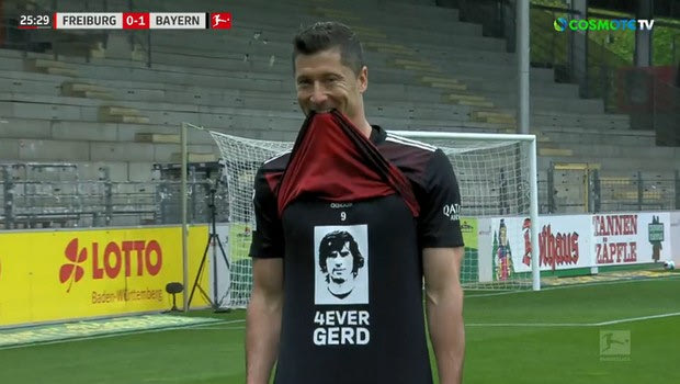 Ο Ρόμπερτ Λεβαντόβσκι σκόραρε με πέναλτι κόντρα στην Φράιμπουργκ και ισοφάρισε το ρεκόρ του Γκερντ Μίλερ με 40 γκολ σε μία σεζόν στην Bundesliga, με τον Πολωνό να πανηγυρίζει με μπλούζα του θρυλικού Γερμανού αρχισκόρερ (VIDEO).