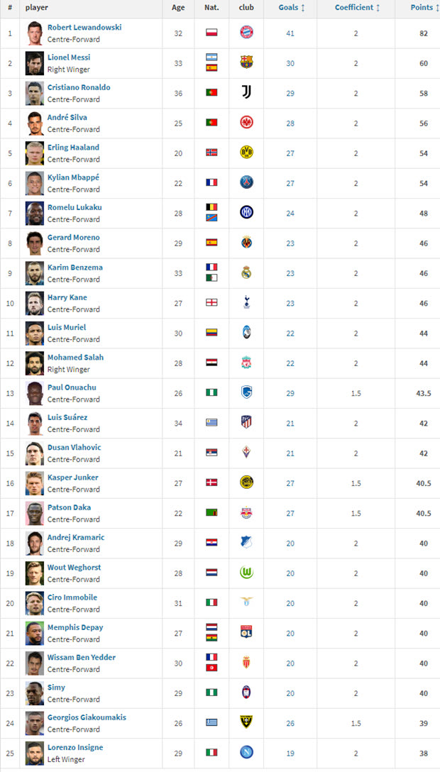 Ο 32χρονος ποδοσφαιριστής συγκέντρωσε 82 πόντους, αφού ο συντελεστής δυσκολίας του πρωταθλήματός του είναι 2, αφήνοντας πολύ πίσω τον Λιονέλ Μέσι, ο οποίος με 30 γκολ και 60 πόντους, δεν είχε ελπίδες να πλησιάσει τον Λεβαντόβσκι στις τελευταίες αγωνιστικές. Το βάθρο συμπλήρωσε ο Κριστιάνο Ρονάλντο, ο οποίος πέτυχε 29 γκολ στη Serie A και συγκέντρωσε 58 πόντους.