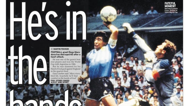 Οι αγγλικές εφημερίδες αφιερώνουν τα πρωτοσέλιδα στον Ντιέγκο Μαραντόνα, αλλά δεν ξεχνούν το "χέρι του Θεού", αποκαλώντας τον "κλέφτη", ακόμα και μετά το θάνατό του.