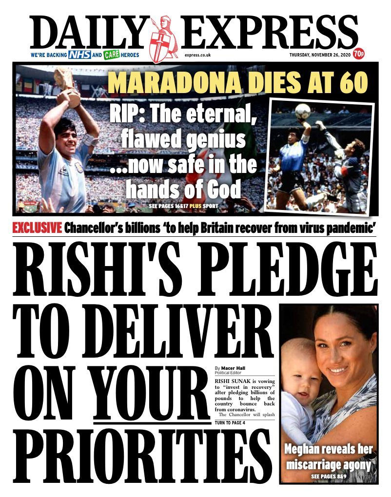 Από την άλλη πλευρά, η Daily Star έχει φωτογραφία απ’ τη φάση με το χέρι του Μαραντόνα κόντρα στην Αγγλία, γράφοντας: “Πού ήταν το VAR όταν το χρειαζόμασταν περισσότερο;”, ενώ τόσο η Sun όσο και η Express κάνουν ειδική μνεία σε αυτό το γεγονός στα πρωτοσέλιδά τους.
