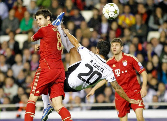 15. Εντυπωσιακή προσπάθεια του Ρικάρντο Κόστα μπροστά από τον Χάβι Μαρτίνεθ, με τον Τόμας Μίλερ να παρακολουθεί. Βαλένθια – Μπάγερν, όμιλος Τσάμπιονς Λιγκ (20/11/2012)