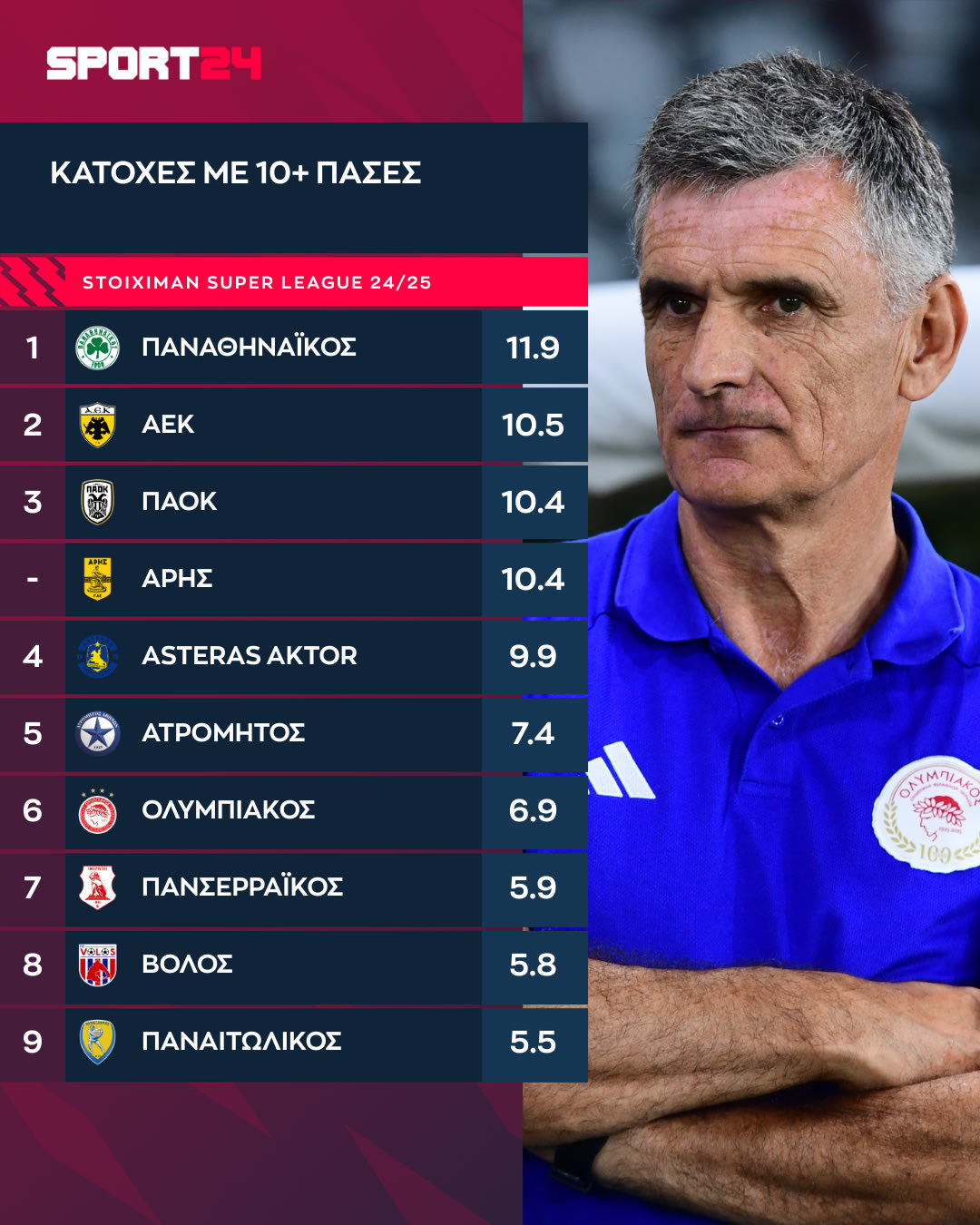 Αρχίζουμε με τις κατοχές με 10 ή περισσότερες πάσες. Αυτή είναι η εικόνα μετά τις πρώτες οκτώ αγωνιστικές της φετινής Stoiximan Super League.