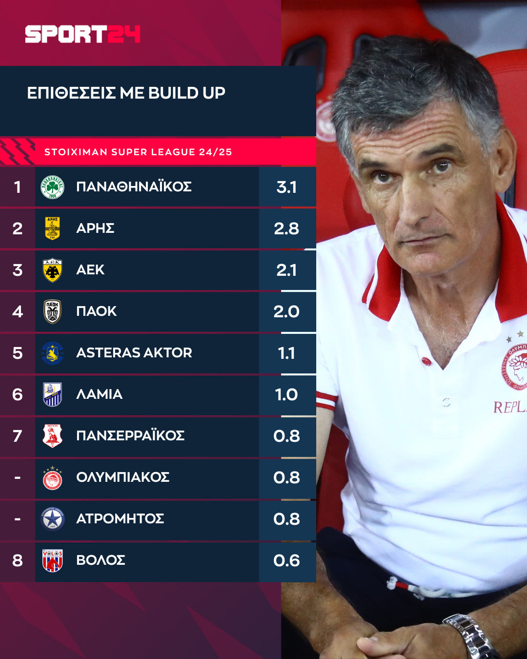 Παρόμοια εικόνα. Ο Ολυμπιακός μακριά από τις πρώτες θέσεις, με επίδοση πολύ μακριά από τις κορυφαίες. Ο Παναθηναϊκός έχει 3+ επιθέσεις με build up, οι άλλες μεγάλες ομάδες έχουν πάνω από δύο και οι ερυθρόλευκοι έχουν μόλις 0.8.