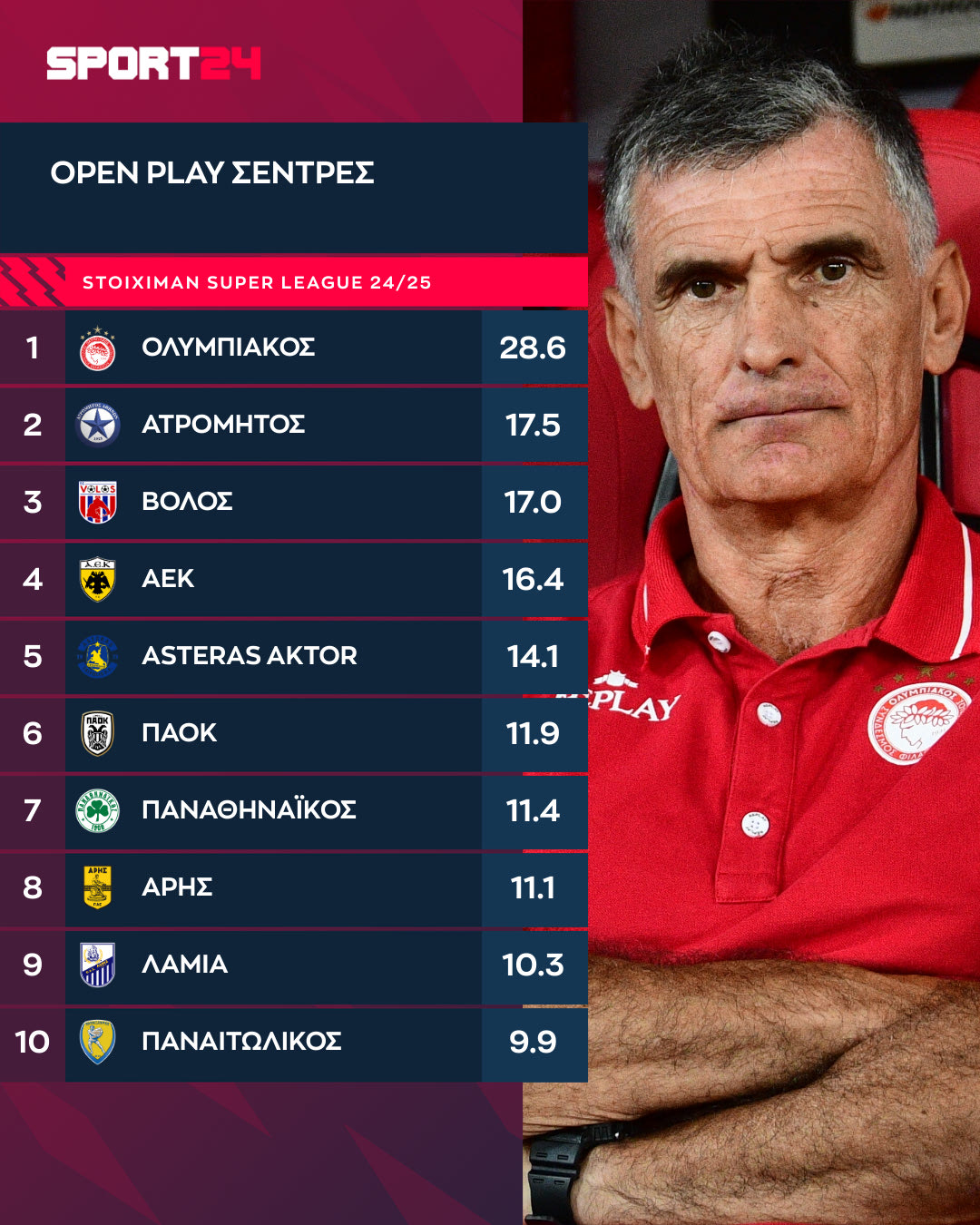 Όχι μόνο πρώτος ο Ολυμπιακός, αλλά μακράν του δευτέρου. Οι ερυθρόλευκοι κάνουν 28.6 σέντρες ανά αγώνα, την ώρα που καμία άλλη ομάδα δεν περνάει τις 18.