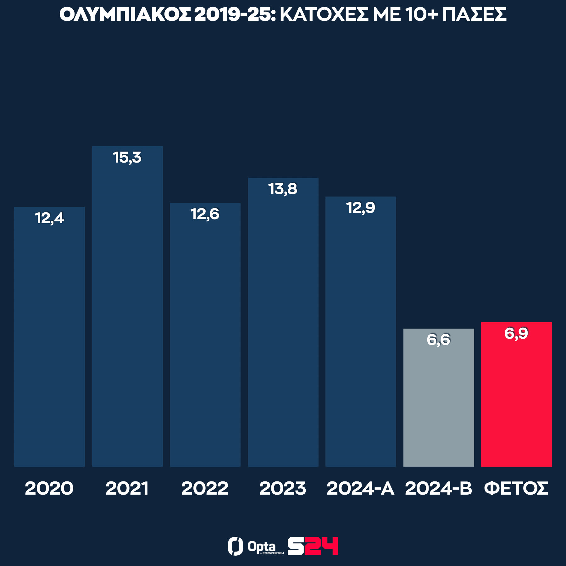 Ο Ολυμπιακός ήταν πάντα ομάδα που έκανε 12+ κατοχές με 10+ πάσες. Και στις τρεις χρονιές του Μαρτίνς και στη σεζόν με Κορμπεράν/Μίτσελ/Ανιγκό και πέρυσι με Μαρτίνεθ/Καρβαλιάλ.