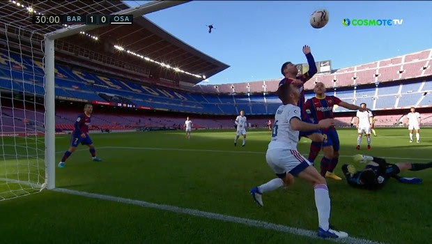 Η Μπαρτσελόνα άνοιξε το σκορ απέναντι στην Οσασούνα στο 29ο λεπτό με τον Μπρέιθγουεϊτ και τον Λιονέλ Μέσι να προσπαθεί να μιμηθεί το χέρι του θεού. (VIDEO)