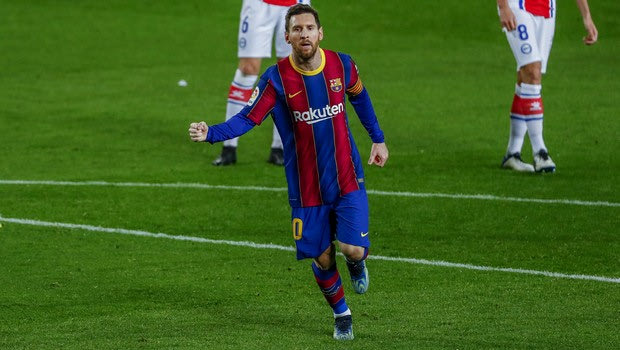 Ο Λιονέλ Μέσι πανηγυρίζει γκολ του με τη φανέλα της Μπαρτσελόνα κόντρα στην Αλαβές