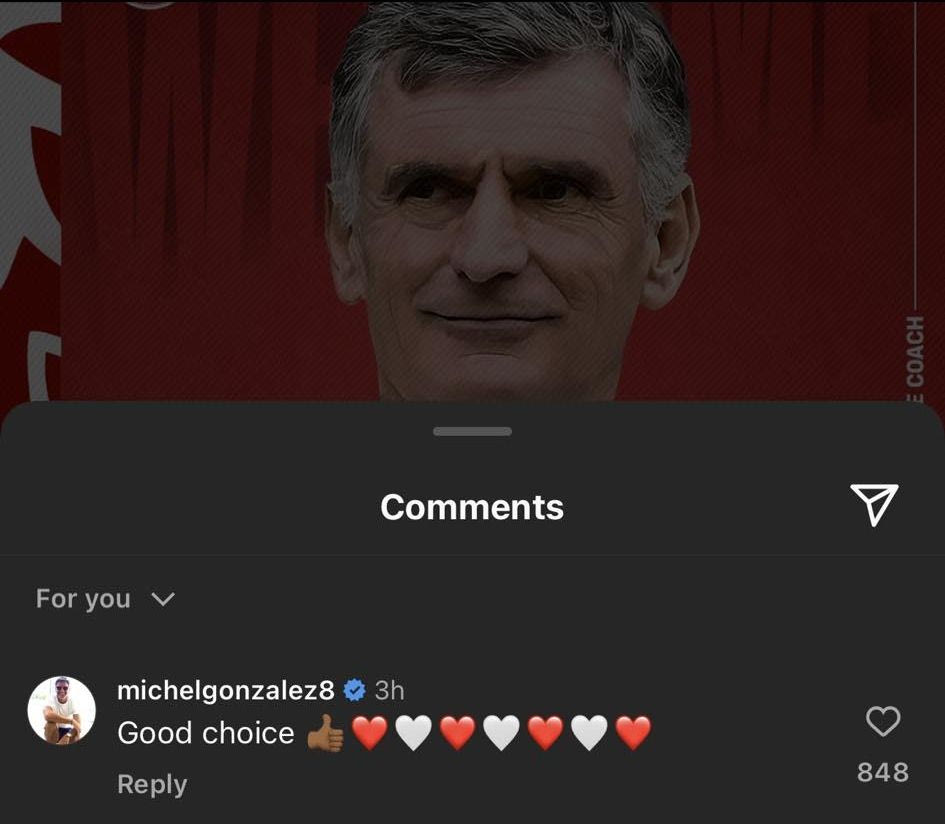 Στο ποστ των Πειραιωτών στο Instagram, όπου ανακοίνωσαν τον νέο τους προπονητή, σχολίασε ο Μίτσελ, ο οποίος αποχώρησε για δεύτερη φορά από τον πάγκο του Ολυμπιακού τον περασμένο Απρίλιο.
