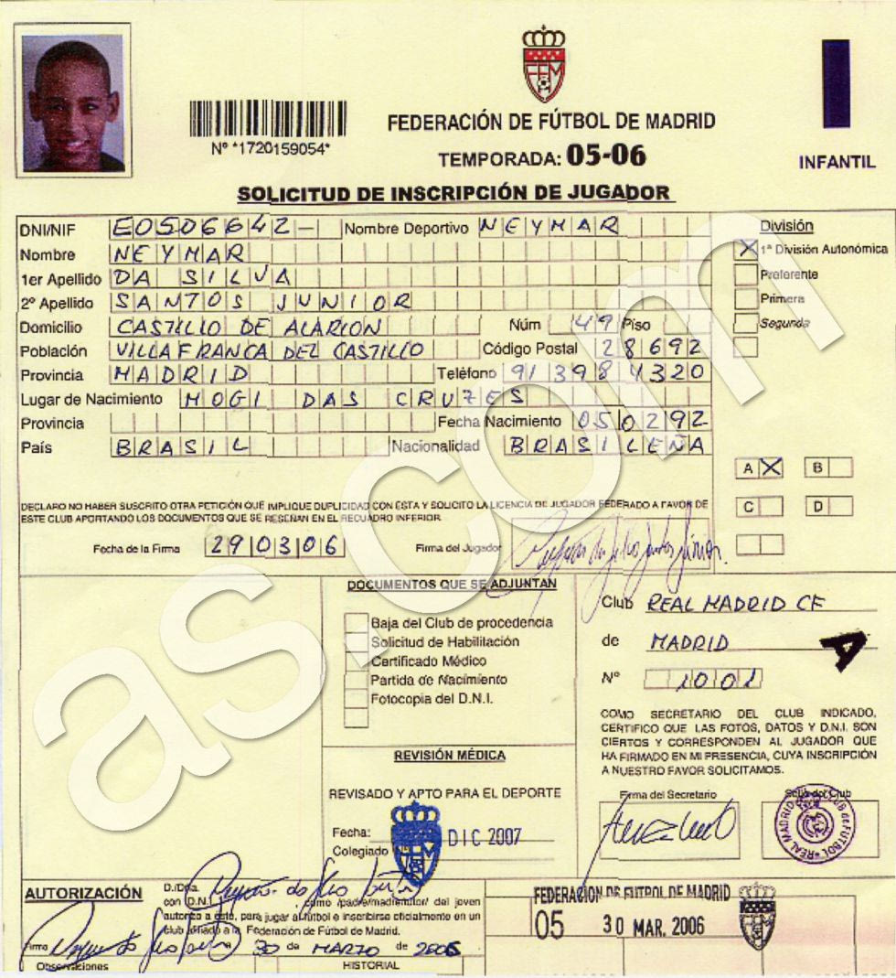 Εκείνη τη χρονιά, οι “μερένγκες” είχαν βγάλει δελτίο στην Ποδοσφαιρική Ομοσπονδία της Μαδρίτης, προκειμένου ο ταλαντούχος Βραζιλιάνος να μπορεί να αγωνίζεται και να δείξει τις αρετές του στους προπονητές της ομάδας. Παρακάτω θα δείτε μάλιστα το έγγραφο, που αποδεικνύει πως ο Νεϊμάρ ανήκε στην Ρεάλ Μαδρίτης από τις 30 Μαρτίου του 2006.
