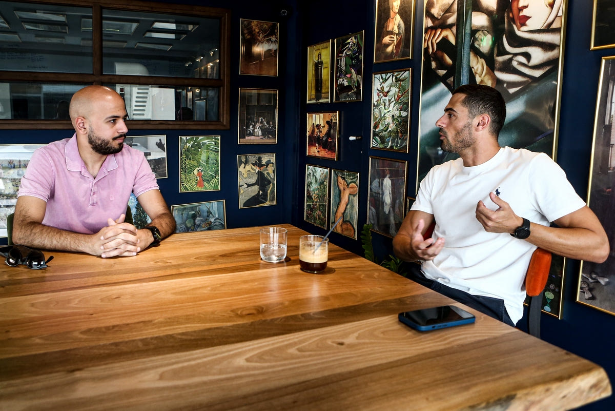 Ο Νίκος Σπυρόπουλος με τον δημοσιογράφο του SPORT24, Ηλία Καλλονά Photo Credits: Andreas Papakonstantinou / Tourette Photography