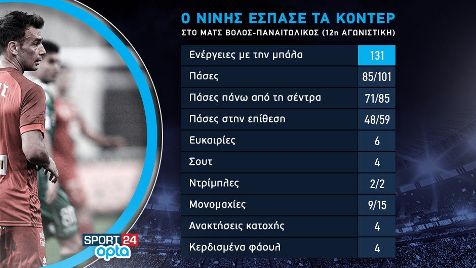 Επιπλέον, απέναντι στην ομάδα του Αγρινίου, ο Νίνης έδωσε και έξι πάσες που έφτιαξαν τελική που αποτελεί τη δεύτερη καλύτερη επίδοση πίσω από τις οχτώ του Πέτρου Μάνταλου στο ματς ΑΕΚ – Λαμία για την 3η αγωνιστική. Στο γεμάτο παιχνίδι του πρέπει να προστεθούν και τα τέσσερα κερδισμένα φάουλ, οι δύο επιτυχημένες ντρίμπλες και οι εννιά κερδισμένες μονομαχίες.