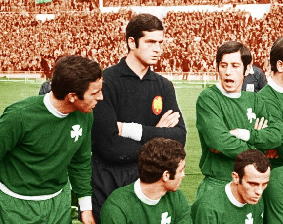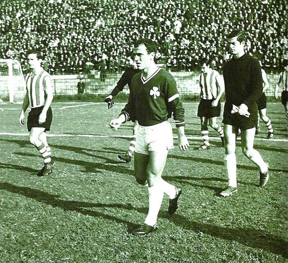 Παναθηναϊκός και Αθλέτικ εισέρχονται στον αγωνιστικό χώρο της “Λεωφόρου” για το ματς του Κυπέλλου Εκθέσεων τον Νοέμβριο του 1968. Πίσω από τον Δομάζο, ο Τάκης Οικονομόπουλος