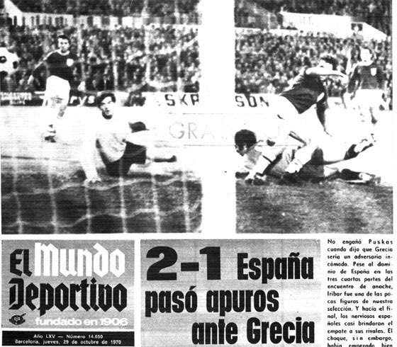 Το πρωτοσέλιδο της Mundo Deportivo την επόμενη του φιλικού μεταξύ Ισπανίας και Ελλάδας, στο οποίο αντάλλαξαν φανέλες Οικονομόπουλος και Ιρίμπαρ. Ο τίτλος γράφει “2-1, η Ισπανία δυσκολεύτηκε απέναντι στην Ελλάδα”, ενώ η φωτογραφία δείχνει τον Αραγονές (δεξιά στο έδαφος) να πετυχαίνει το 1-0 (29/10/1970)