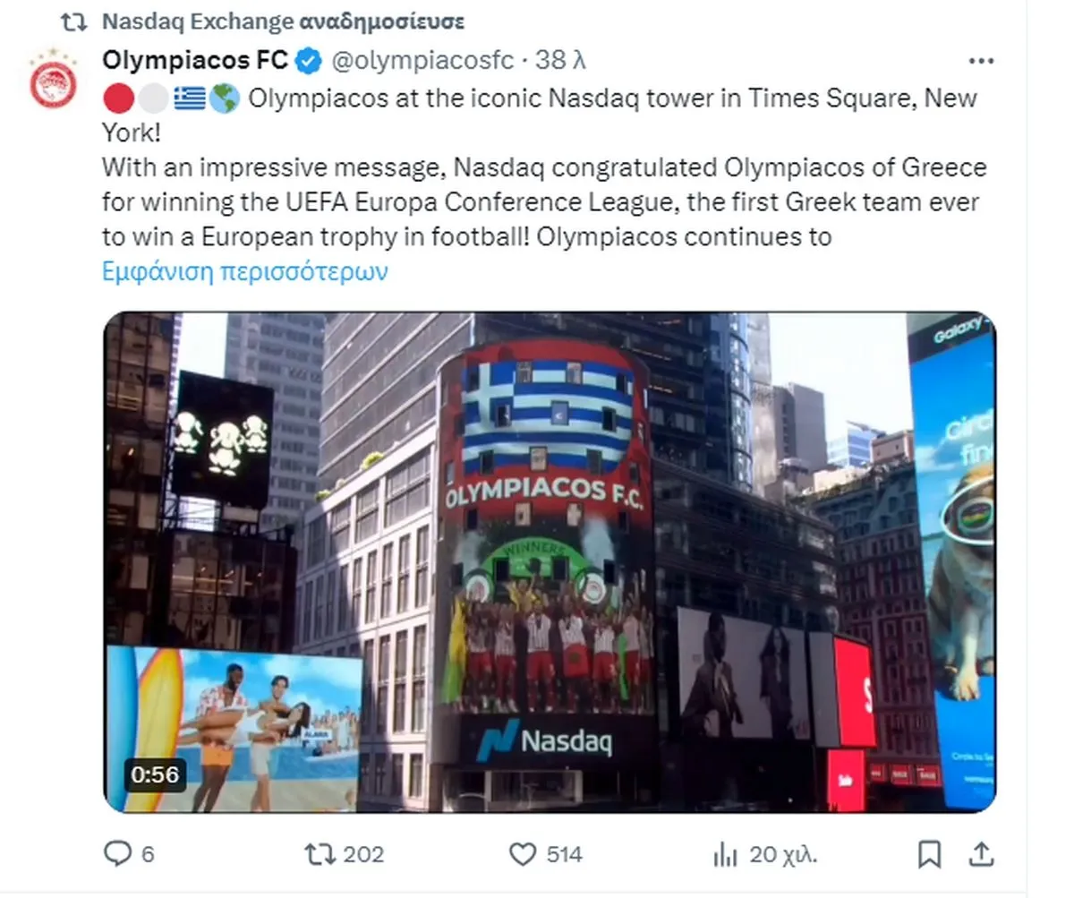 Με μήνυμα το Nasdaq, στην καρδιά της Νέας Υόρκης, συνεχάρη τον Ολυμπιακό για την κατάκτηση του Conference League.