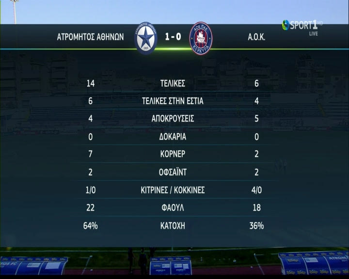 Προφανώς με αυτά τα σχήματα δεν ήταν δυνατό να υπάρχει χημεία στις δύο ομάδες και μέχρι το 30′ δεν συνέβη απολύτως τίποτα στο παιχνίδι. Στο τελευταίο τέταρτο του πρώτου μέρους ο Ατρόμητος προσπάθησε να απειλήσει δύο φορές με απευθείας φάουλ και η Κέρκυρα με ισάριθμες αντεπιθέσεις, χωρίς επιτυχία. Έτσι το 0-0 ήταν η φυσιολογική κατάληξη των όσων (δεν) έγιναν στο πρώτο ημίχρονο στο Περιστέρι.