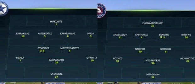 Πάρα πολλές αλλαγές από τους προπονητές των δύο ομάδων σε σχέση με τα πρόσφατα ματς του πρωταθλήματος. Ο Κάναντι έκανε έξι αλλαγές στην 11άδα που ξεκίνησε στη Λάρισα (στο 0-0 με την ΑΕΛ), ενώ ο Βοσνιάδης δέκα (!) κρατώντας μόνο τον τερματοφύλακα Γιαννακόπουλο σε σχέση με το ματς στα Χανιά (επίσης 0-0 κόντρα στον Πλατανιά).