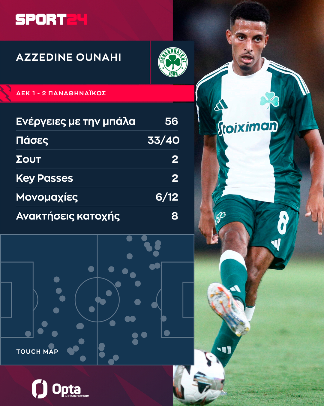 Ο Αζεντίν Ουναχί έμεινε στο χορτάρι για 77 λεπτά, καθώς ο Μανώλης Σιώπης πέρασε στη θέση του. Ο Μαροκινός μέσος ολοκλήρωσε το παιχνίδι με 56 ενέργειες με την μπάλα, οι οποίες απλώθηκαν σε όλο το χορτάρι όπως φαίνεται στο γράφημα της Opta Stats / Perform.
