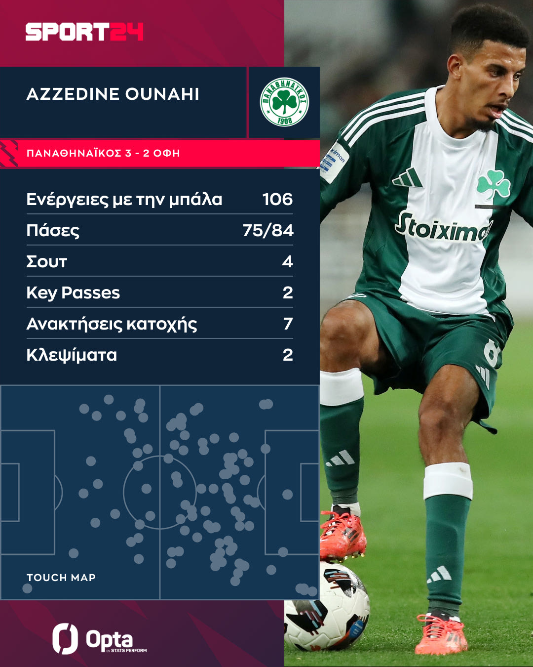 Η παρουσία του Αζεντίν Ουναχί κόντρα στον ΟΦΗ δεν έγινε τόσο αισθητή όσο άλλων, ωστόσο ο Μαροκινός μέσος έδειξε για άλλη μια φορά την ποιότητά του στη μεσαία γραμμή των πρασίνων. Το SPORT24 με τη βοήθεια της Opta Stats/Perfom αναλύει.