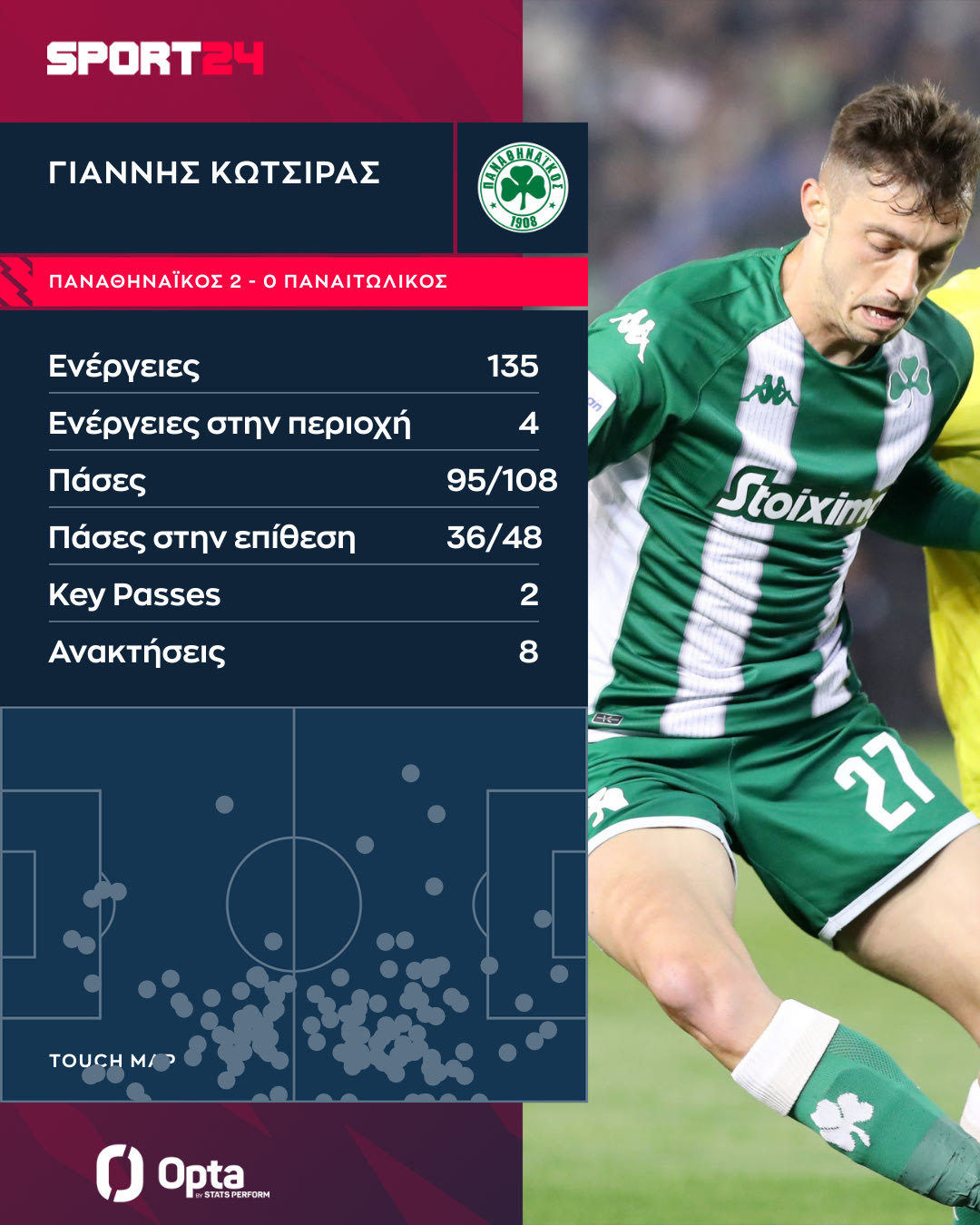 Η εξαιρετική του εμφάνιση όμως δεν σταμάτησε εκεί καθώς ο δεξιοπόδαρος μπακ του τριφυλλιού είχε ακόμα 8 ανακτήσεις μπάλας και 2 key passes από τις οποίες οι πράσινοι έφτιαξαν τελική στην αναμέτρηση με τον Παναιτωλικό.