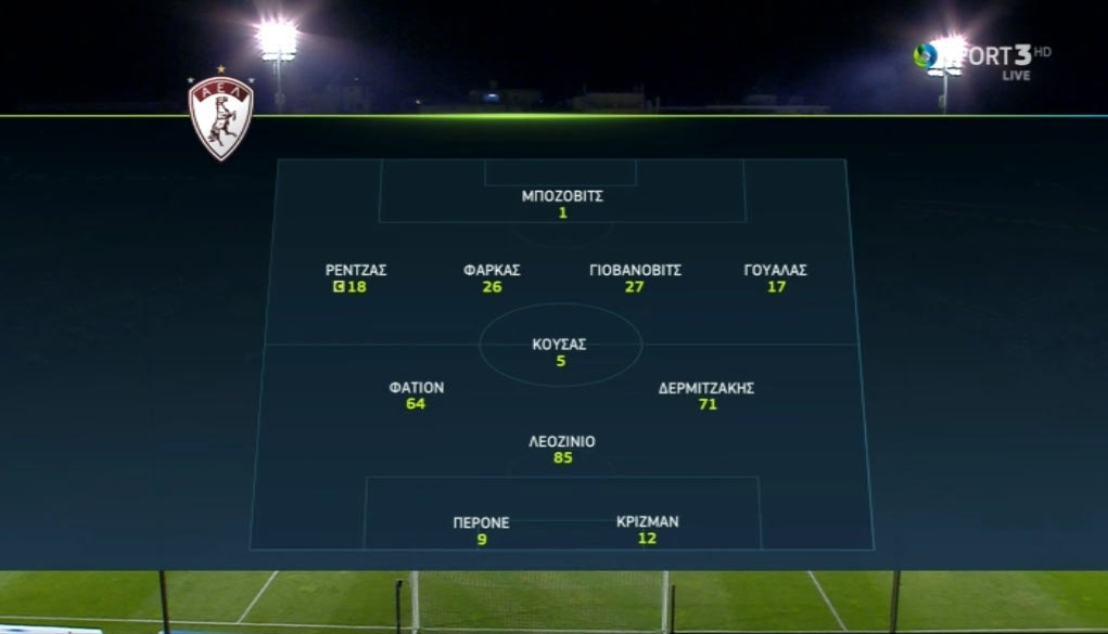 Από την άλλη η ΑΕΛ στο δεύτερο ματς με τον Ματάισεν στον πάγκο της παρατάχθηκε στην Λεωφόρο με 4-4-2 σε ρόμβο, με τον Λεοζίνιο να παίζει πίσω από το επιθετικό δίδυμο των Περόνε, Κριζμάν.