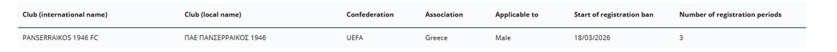 Την Τετάρτη (18/3) η FIFA επέβαλε στον Πανσερραϊκό ποινή απαγόρευσης μεταγραφών για τρεις περιόδους, έπειτα από προσφυγή ποδοσφαιριστή, ο οποίος έχει αποχωρήσει από την ομάδα των Σερρών.
