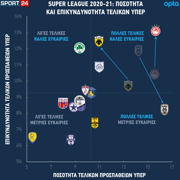 Μόνο ο Άρης και οι δύο ομάδες που θα παλέψουν για τη σωτηρία (Απόλλων, Παναιτωλικός) κάνουν κατά μέσο πιο ακίνδυνες τελικές από τον ΠΑΟΚ.