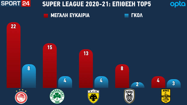 Η εικόνα μιλάει από μόνη της. Ο Ολυμπιακός έχει 22 μεγάλες ευκαιρίες, η ΑΕΚ έχει 13 και ο ΠΑΟΚ μόνο οκτώ, παρότι έχει ένα παιχνίδι περισσότερο.
