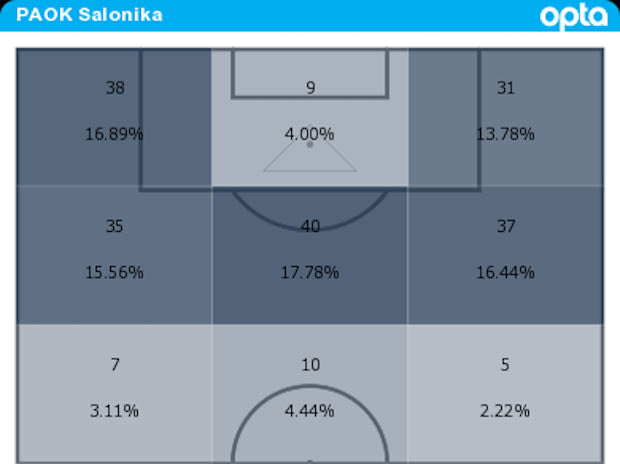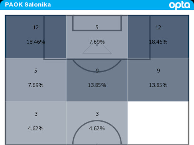 Οι αριθμοί δείχνουν το σύνολο των ευκαιριών που προήλθαν από κάθε ζώνη και το ποσοστό επί του συνόλου. Ο περσινός ΠΑΟΚ πήρε τη μερίδα του λέοντος από το καλύτερο σημείο, από τη Zone 14. Έτσι ονομάζεται ο κεντρικός χώρος έξω από τη μεγάλη περιοχή, στο ημικύκλιο.