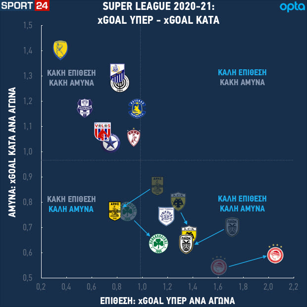 Την ίδια στιγμή ο Ολυμπιακός έχει κάνει “άλμα” προς τα μπροστά στην επίθεση, από το περσινό 1.62 στο φετινό 2.06. Ναι, ο Ολυμπιακός δεν έχει παίξει ακόμα ντέρμπι, λογικό να έχει καλύτερες επιδόσεις στην επίθεση, αλλά και ο ΠΑΟΚ θα έπρεπε να έχει κάνει το ίδιο.