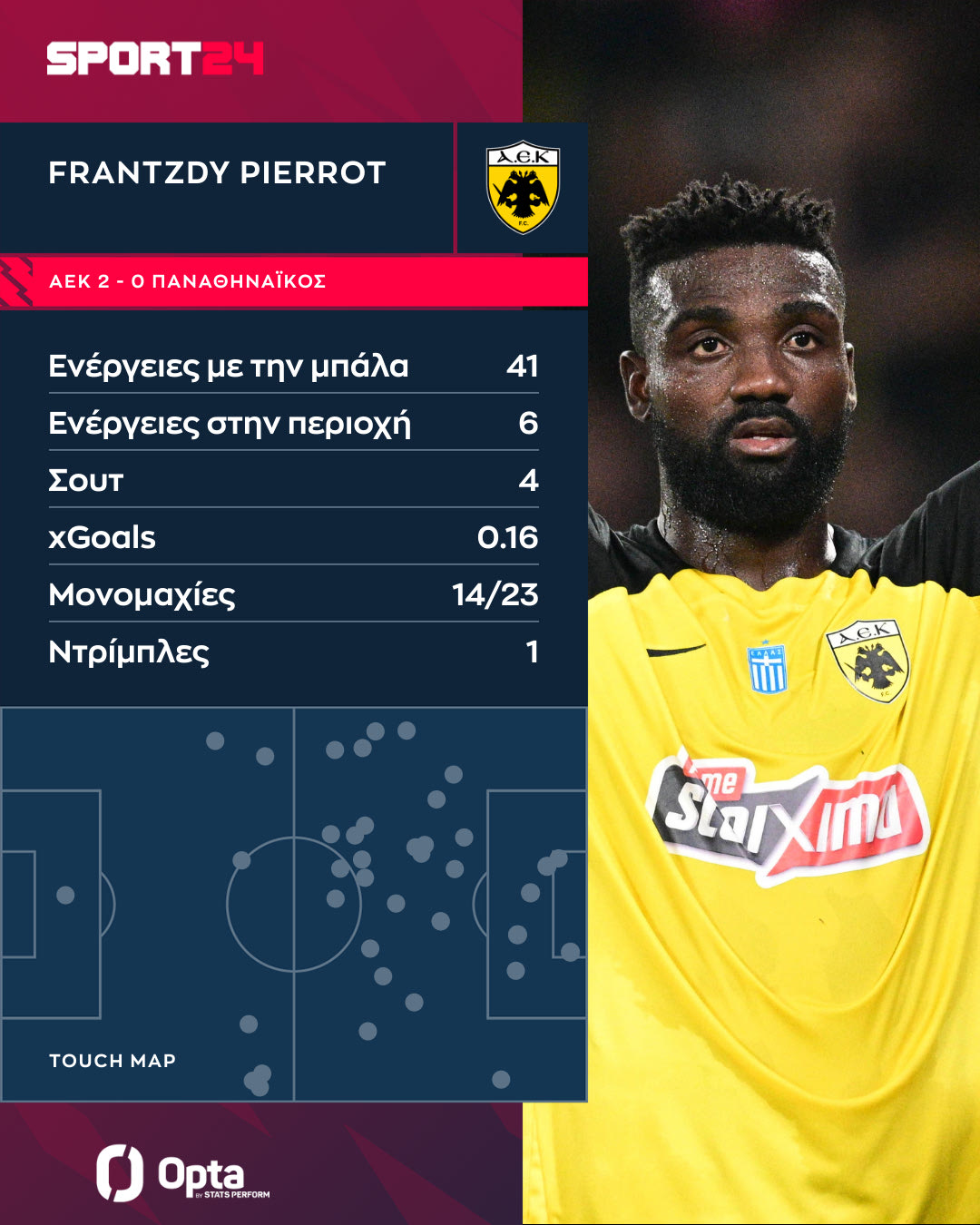 Αν το συγκρίνουμε με το θετικό ντεμπούτο με τον Βόλο (κόντρα σε έναν πιο αδύναμο αντίπαλο), βλέπουμε ότι ο Αϊτινός επιθετικός στάθηκε πολύ καλύτερα στον αγωνιστικό χώρο και προσπαθεί κι αυτός με τη σειρά του να προσαρμοστεί στο παιχνίδι της ΑΕΚ. Το γράφημα της Opta Stats/Perform με τις ενέργειές του κόντρα στην ομάδα της Μαγνησίας είναι ενδεικτικό.
