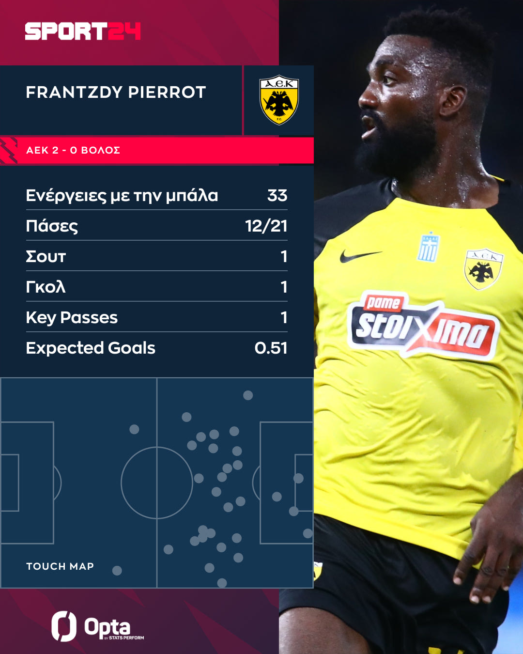 Ο Φράντζι Πιερό έκανε ντεμπούτο με την ΑΕΚ παίζοντας μάλιστα ως βασικός κόντρα στον Βόλο (μιας και ο Λιβάι Γκαρσία τέθηκε εκτός μάχης) και πέτυχε το πρώτο του γκολ με τα κιτρινόμαυρα. Το SPORT24 σάς παρουσιάζει όσα έκανε ο Αϊτινός φορ στην πρώτη του παράσταση.