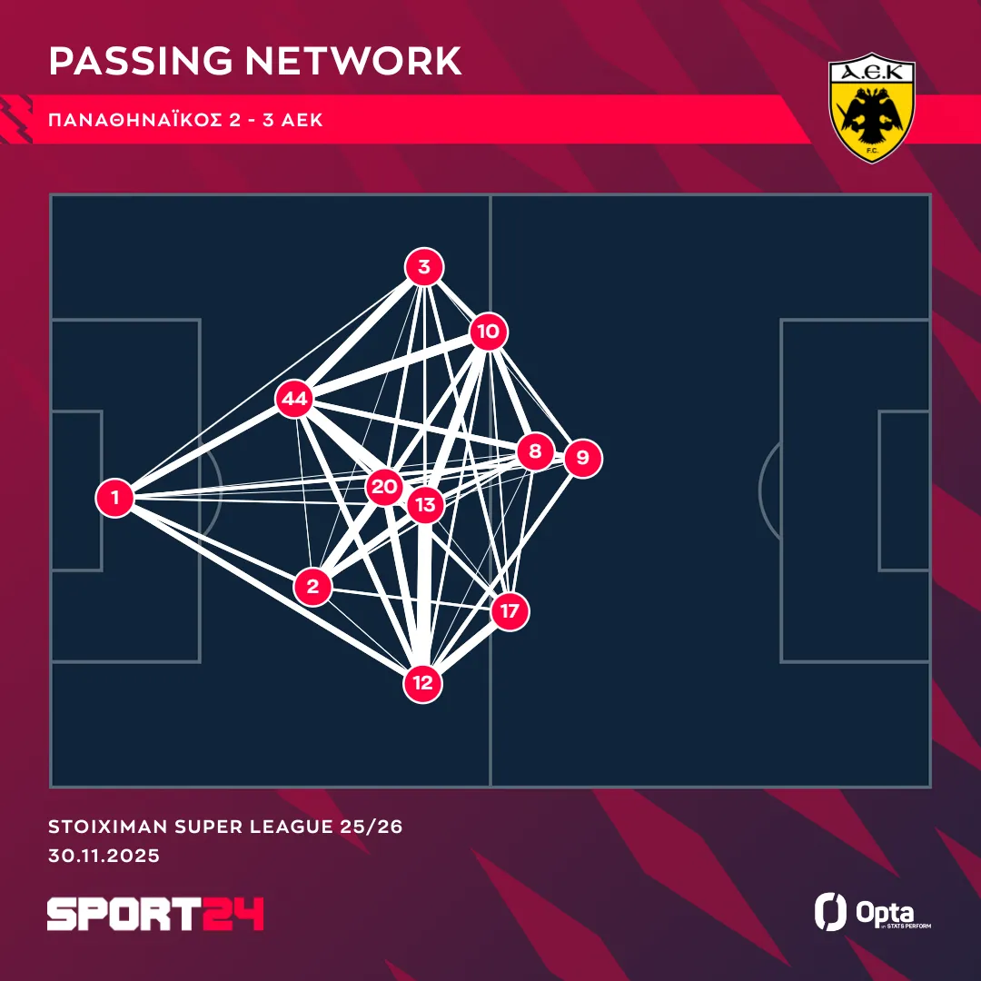 Ο Μάρκο Νίκολιτς παρέταξε την ΑΕΚ με την κλασική διάταξη του πρωταθλήματος, καθώς δεν προχώρησε σε ένα 4-3-3, όπως έκανε με τη Φιορεντίνα, αλλά με την κλασική διάταξη με τους Πινέδα (13) και Μάνταλο (20) να δίνουν τις μάχες τους στον χώρο του κέντρου και τον Μιγιάτ Γκατσίνοβιτς (8) πιο προωθημένο ως στήριγμα του Λούκα Γιόβιτς στην κορυφή της επίθεσης, όπως φαίνεται στο γράφημα της Opta Stats / Perform.