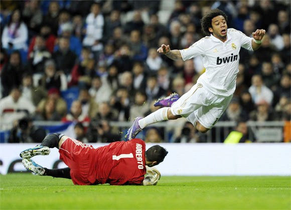 16. Ο Ρομπέρτο μπλοκάρει τη μπάλα μπροστά από τον Μαρσέλο σε αγώνα της Ρεάλ με τη Σαραγόσα στο “Σαντιάγο Μπερναμπέου” (28/1/2012)