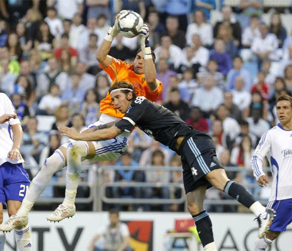 18. Έξοδος μπροστά από τον Σέρχιο Ράμος σε αγώνα της Σαραγόσα με τη Ρεάλ Μαδρίτης στη “Ρομαρέδα” (24/4/2010)