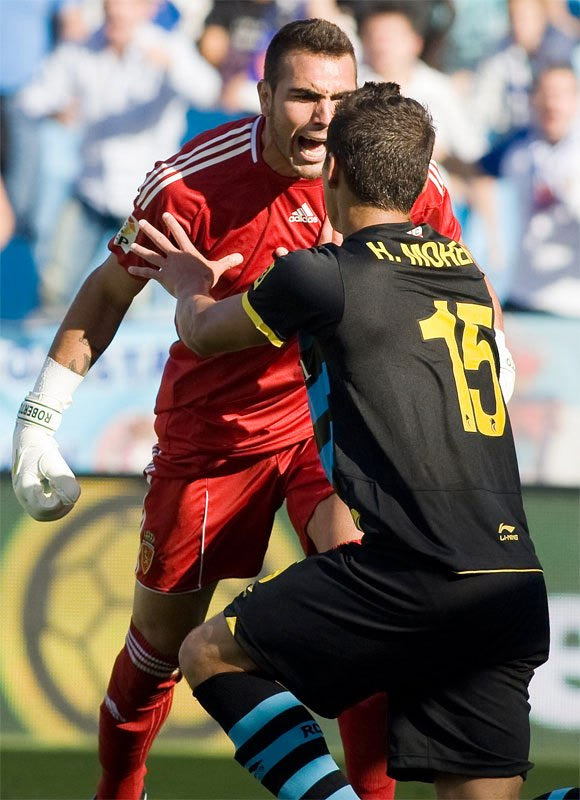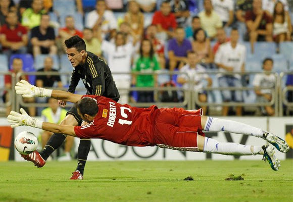 20. Ο Ρομπέρτο αποκρούει εντυπωσιακά τη μπάλα μπροστά από τον Καγεχόν σε αγώνα της Σαραγόσα με τη Ρεάλ Μαδρίτης στη “Ρομαρέδα” (28/8/2011)