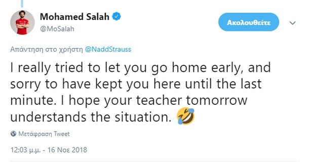 Ο μεγάλος σταρ της Αιγύπτου και της Λίβερπουλ έκανε το χρέος του, αλλά καθυστερημένα για τη μικρή θαυμάστριά του. Σκόραρε στο 90′ και χάρισε τη νίκη στην ομάδα του με 3-2! Έτσι, λίγες ώρες μετά θέλησε να απαντήσει στη μαθήτρια, γράφοντας χιουμοριστικά στον λογαριασμό του στο twitter: