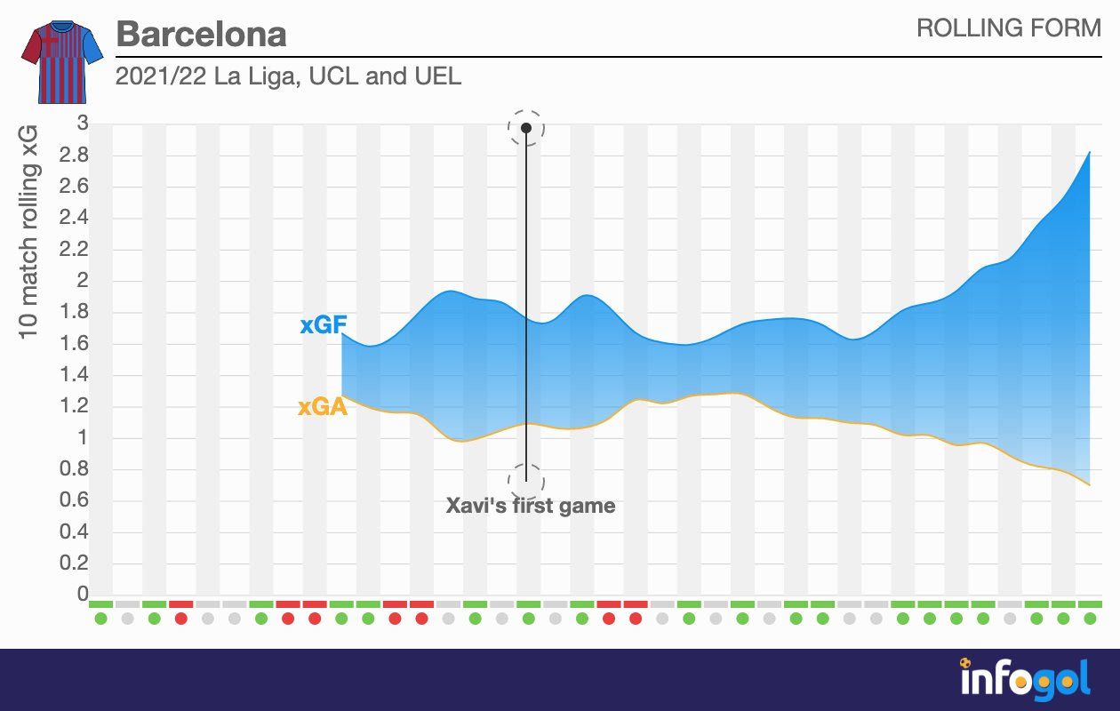 Στα 13 παιχνίδια του Κούμαν τη φετινή σεζόν, σε La Liga και Champions League, η Μπαρτσελόνα σκόραρε 15 φορές και είχε 20,9 xG. Στα 22 παιχνίδια επί Τσάβι σε πρωτάθλημα και Ευρώπη, η Μπαρτσελόνα έχει 44 γκολ και 38,96 xG. Ακόμα κι αν γίνει προσαρμογή λόγω της διαφοράς του αριθμού των αγώνων, είναι ξεκάθαρο ότι η εικόνα της Μπαρτσελόνα έχει βελτιωθεί αισθητά και στην επίθεση.