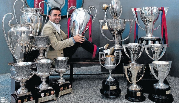 Ο Τσάβι ποζάρει με τα 16 τρόπαια που είχε κατακτήσει μέχρι τον περασμένο Ιούνιο. Λείπουν φυσικά τα δυο Σούπερ Καπ (Ευρώπης και Ισπανίας) του Αυγούστου, που ανέβασαν τους τίτλους του χαρισματικού μέσου στους 18!