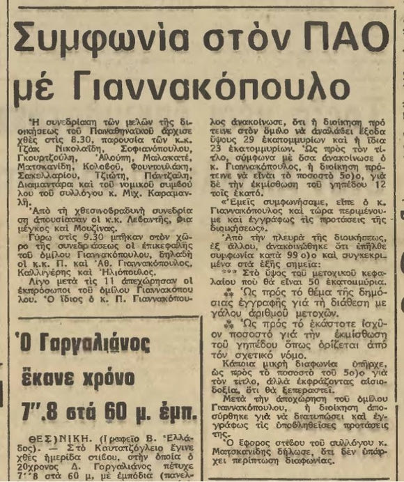 Στις 14 Ιουλίου η Αθλητική Ηχώ ενημέρωνε ότι ο Παύλος Γιαννακόπουλος τη Δευτέρα 16 Ιουλίου θα καταθέσει πρόταση ύψους 100 εκατομμυρίων δραχμών για το μετοχικό κεφάλαιο και την ίδια στιγμή, ο Γιώργος Βαρδινογιάννης αγόραζε μετοχές αξίας 3 εκατομμυρίων δραχμών.