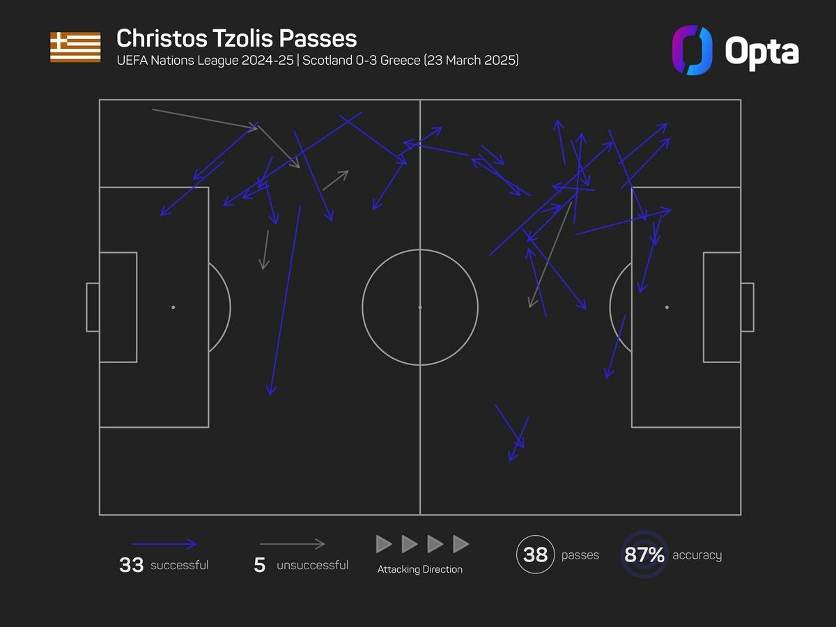 Σπουδαία ήταν και η επίδοση του Τζόλη στο κομμάτι των μεταβιβάσεων, καθώς είχε 33/38 εύστοχες πάσες και μόλις μια από αυτές ήταν λάθος στην επίθεση, όπως φαίνεται στο γράφημα τις πάσες που επιχείρησε.