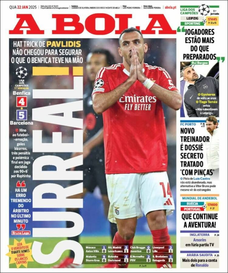 Η A Bola: “Το χατ-τρικ του Παυλίδη δεν ήταν αρκετό για να σταματήσει αυτό που είχε στα χέρια της η Μπενφίκα”.
