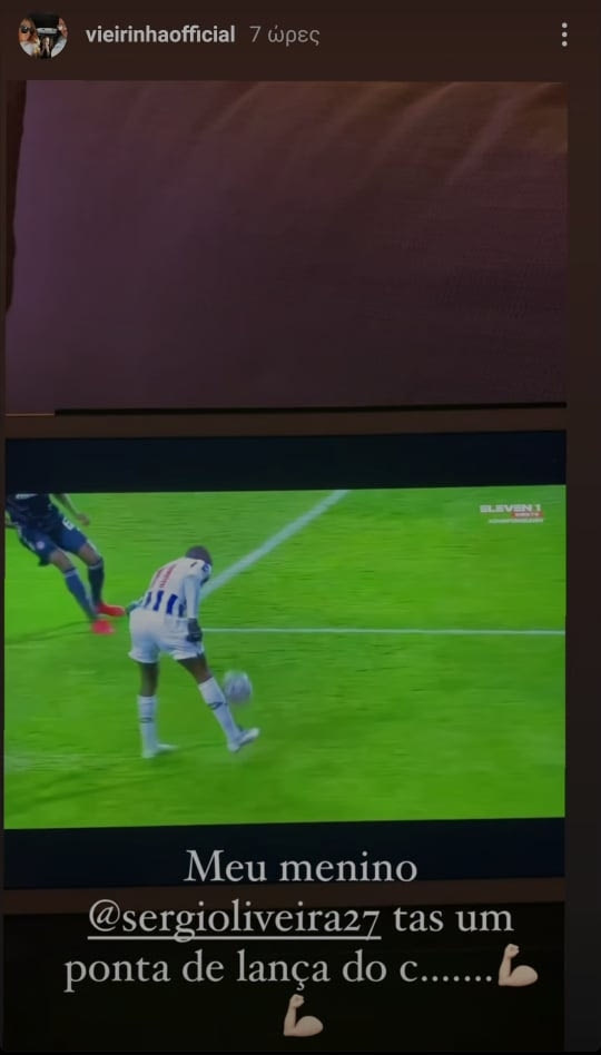 Ο Βιεϊρίνια, μέσω insta stories, αποθέωσε τον πρώην συμπαίκτη του στον ΠΑΟΚ, Σέρτζιο Ολιβέιρα, για την εξαιρετική εμφάνιση που πραγματοποίησε στο Πόρτο - Ολυμπιακός.