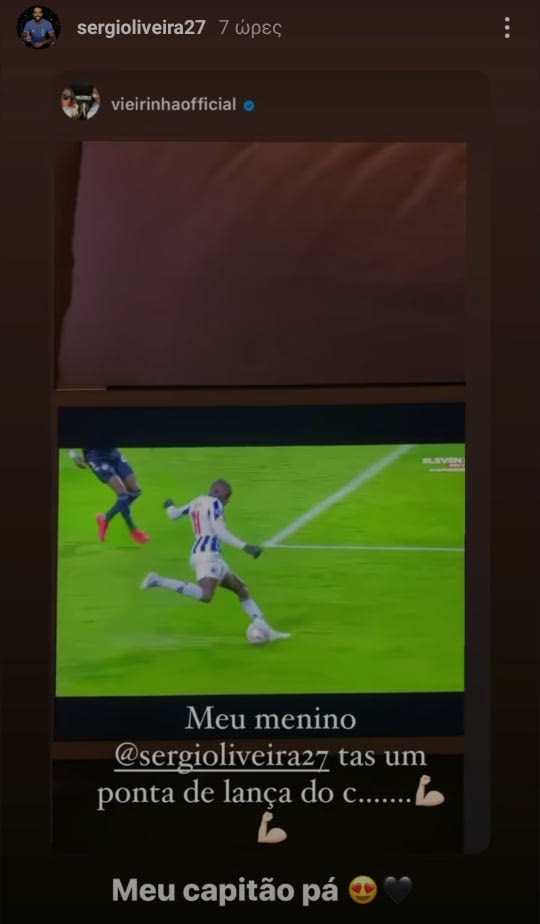 Η πολύ καλή εμφάνιση του χαφ της Πόρτο σχολιάστηκε στα social media κι από τον αρχηγό του Δικεφάλου, Αντρέ Βιεϊρίνια. Ο Πορτογάλος ανέβασε stories στο Instagram, αποθεώνοντας τον συμπατριώτη του. “Το αγόρι μου, ο Σέρτζιο Ολιβέιρα είναι αιχμή του δόρατος”, έγραψε χαρακτηριστικά, ενώ λίγο αργότερα, ο Ολιβέιρα έκανε repost την ανάρτηση, σχολιάζοντας: “Ο αρχηγός μου”.