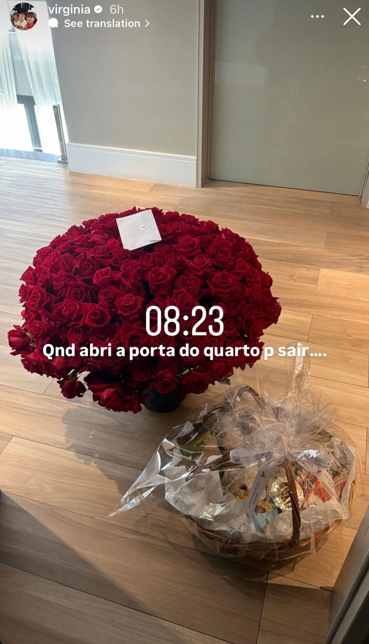 Η διάσημη influencer αποκάλυψε στα stories της ότι λίγο πριν τις 08:30 το πρώι άνοιξε την πόρτα του δωματίου της για να φύγει κι αντίκρισε μια τεράστια, ολοκόκκινη σύνθεση από τριαντάφυλλα και ένα καλάθι με δώρα προσεγμένα μέχρι την τελευταία λεπτομέρεια. Η έκπληξη ήταν οργανωμένη από τον Βινίσιους, ο οποίος θέλησε να γιορτάσει με ξεχωριστό τρόπο τον πρώτο μήνα της νέας τους σχέσης.