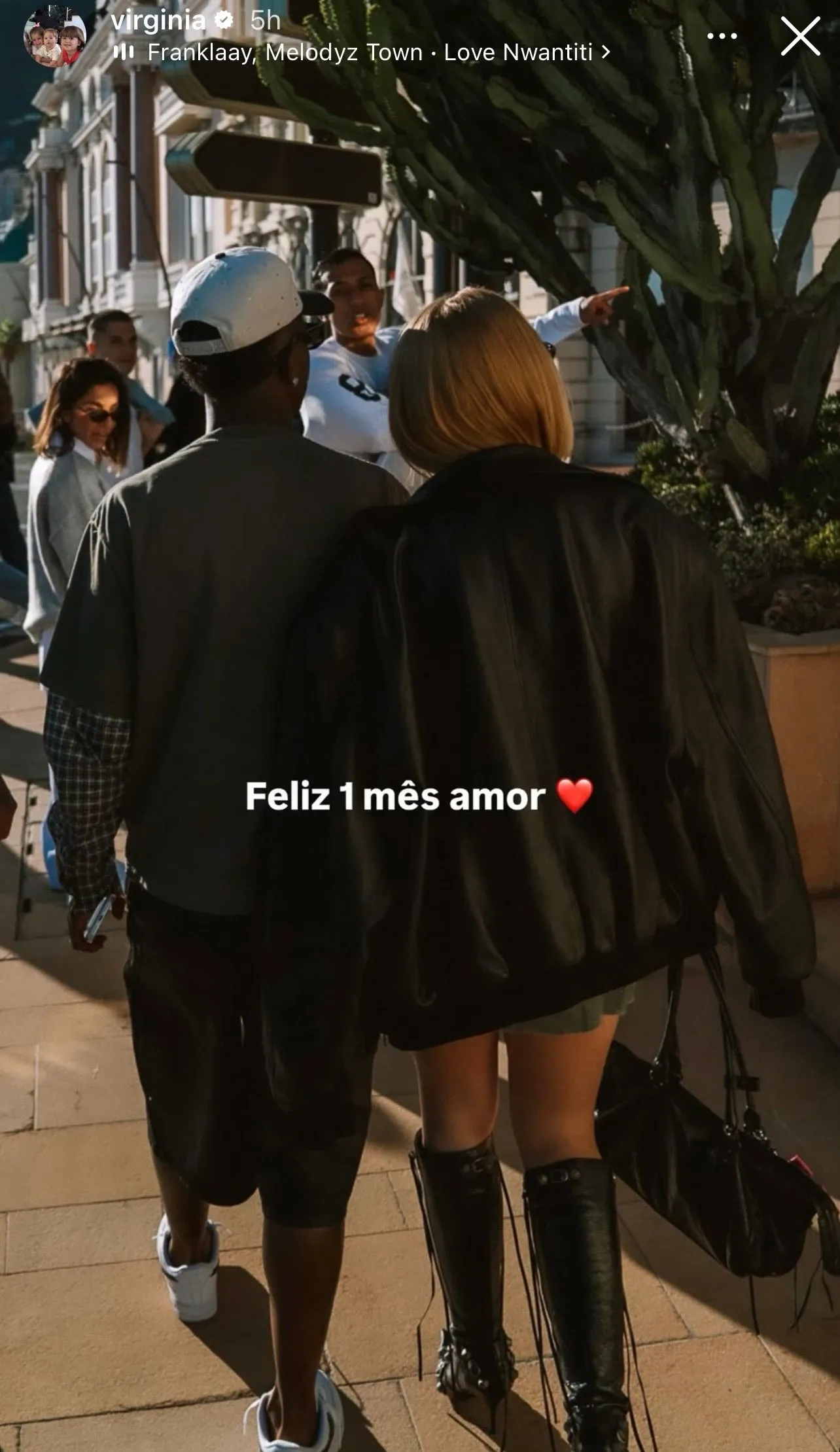 Σε άλλο στιγμιότυπο, η Βιρτζίνια μοιράστηκε και μια φωτογραφία στην οποία περπατά χέρι-χέρι με τον Βινίσιους, σχολιάζοντας με μια σύντομη αλλά γεμάτη συναίσθημα φράση: “Χαρούμενος πρώτος μήνας, αγάπη μου”.