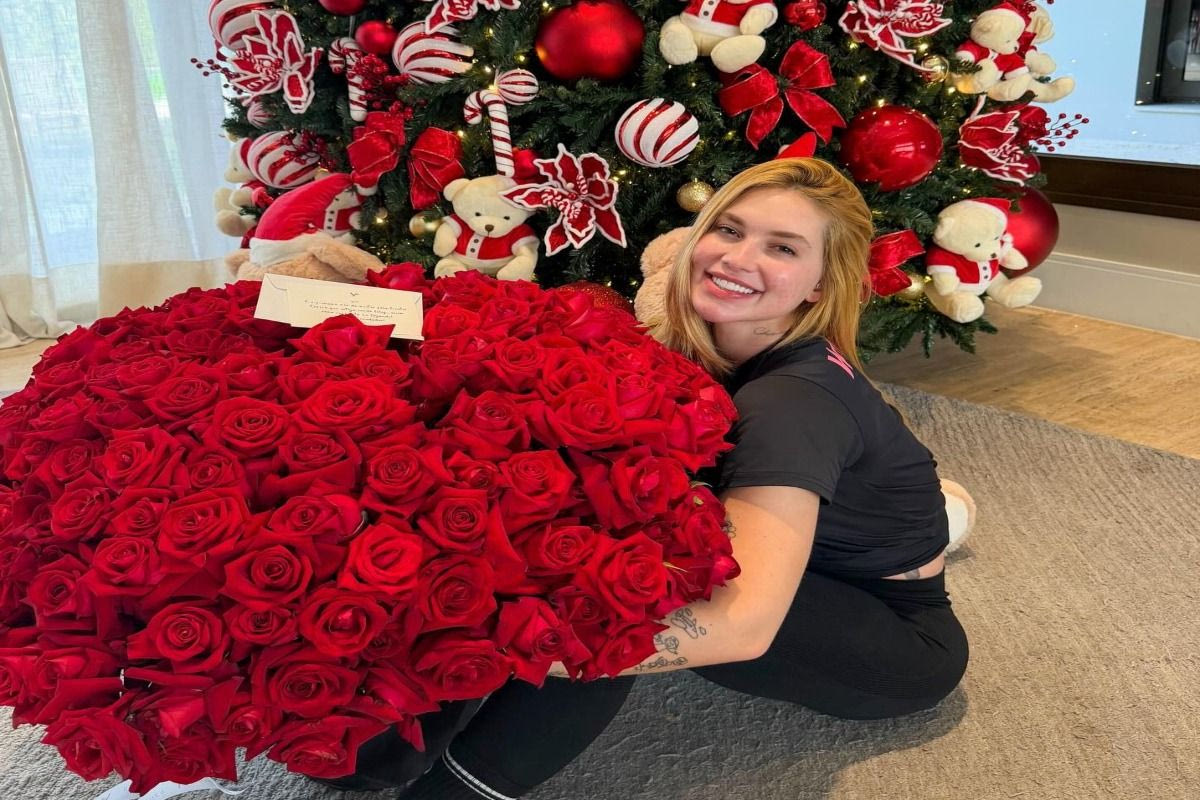 Η ίδια, αναρτώντας φωτογραφίες αγκαλιά με τα τριαντάφυλλα μπροστά στο εντυπωσιακά στολισμένο χριστουγεννιάτικο δέντρο της, έγραψε: “Σήμερα ξύπνησα κακομαθημένη από τον έρωτά μου! Πρώτος μήνας από πολλούς που θα έρθουν, αν θέλει ο Θεός. Σ’ αγαπώ”.