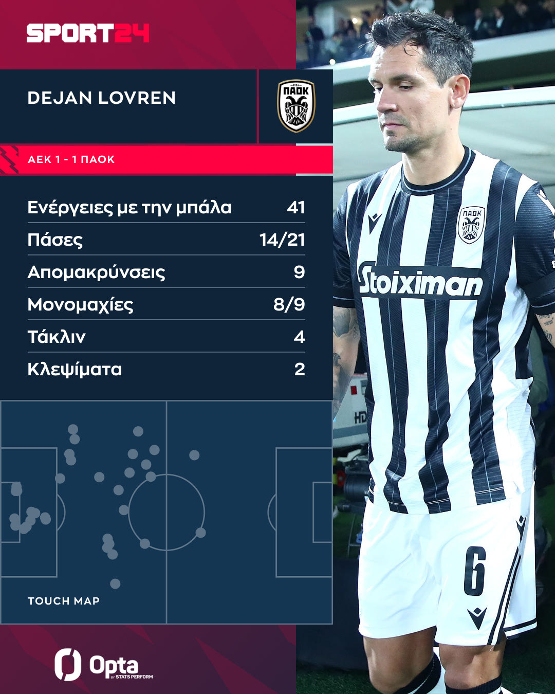Ο Ντέγιαν Λόβρεν ήταν ο καλύτερος παίκτης του ΠΑΟΚ στην OPAP Arena μετά τον σκόρερ, Ραχμάν Μπάμπα, δείχνοντας ότι μπορεί να αναλάβει σταδιακά χρέη "ηγέτη" στο κέντρο της άμυνας του Δικεφάλου.