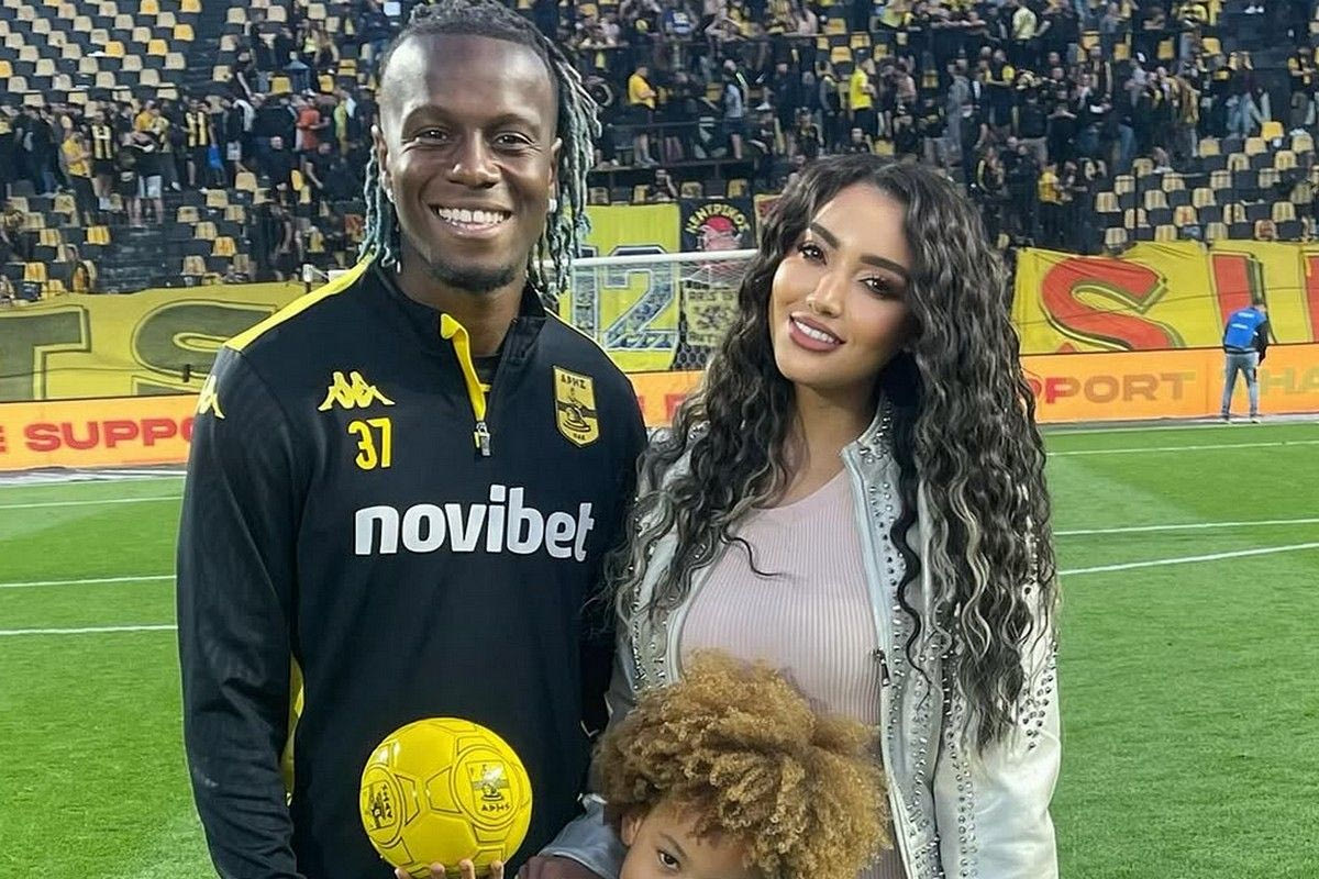 Σε μία από τις πιο χαρακτηριστικές φωτογραφίες, ο Μεντίλ ποζάρει χαμογελαστός στον αγωνιστικό χώρο του “Κλεάνθης Βικελίδης”, με φόντο τις εξέδρες και τους φίλους του Άρη, έχοντας δίπλα του τη σύζυγό του και τον μικρό τους γιο.